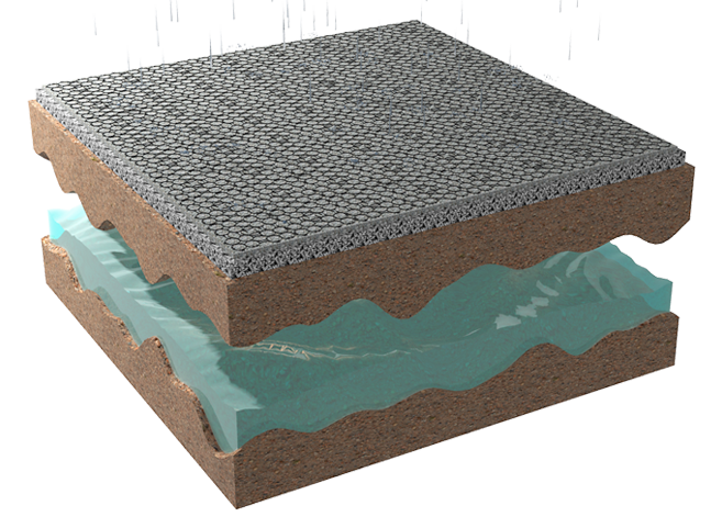 It is a system of plastic grids made from recycled, disposed material. Modules are attached one with another and filled with gravel or grass in order to make firm and permeable floors for almost any kind of land vehicles moving at low speed or for walking purposes.